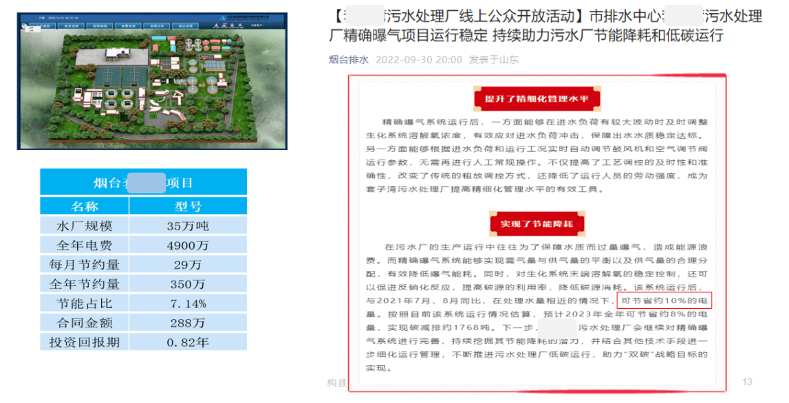 煙臺市某污水廠,每日處理能力35萬噸,對全廠曝氣系統(tǒng)進行智能化升級,可節(jié)電10%,不到1年,收回建設(shè)成本。
